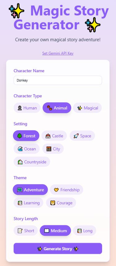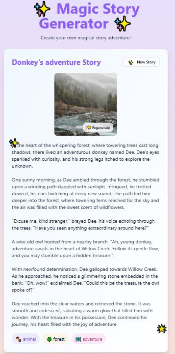 Magic Story Generator is an interactive web application designed to create personalized children's stories with narration and illustrations. The application aims to make storytelling more engaging and accessible for children through a combination of text, audio, and visual elements.